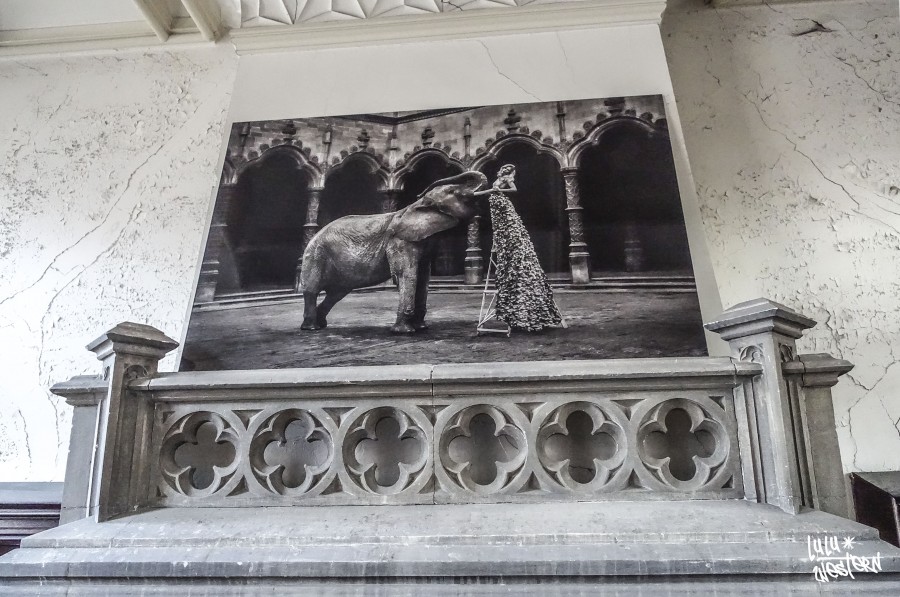 Tirage noir et blanc d’une photo surprenante prise au cœur de la vieille bourse ; image subliminale d’une nymphe à la longue chevelure dorée, juchée en haut d’un immense escabeau et retenue par les défenses d’ivoire d’un jeune éléphant. L’empreinte testimoniale du passage du photographe Marc Lagrange, disparu trop tôt en décembre 2015.