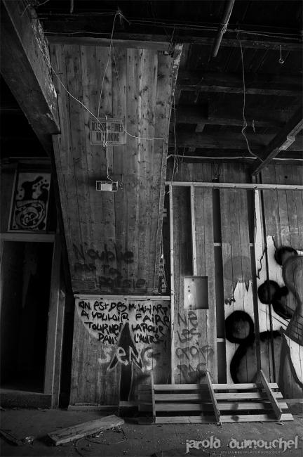 En pénétrant cette vieille usine de pancartes de toute sorte, nous découvrons à l’étage un vieux matelas entouré de déchets. En nous approchant un peu, nous apercevons qu’au-delà des vieux sacs de Doritos et de Ruffles, il y a des seringues et des condoms. L’abri d’un toxicomane sans doute.