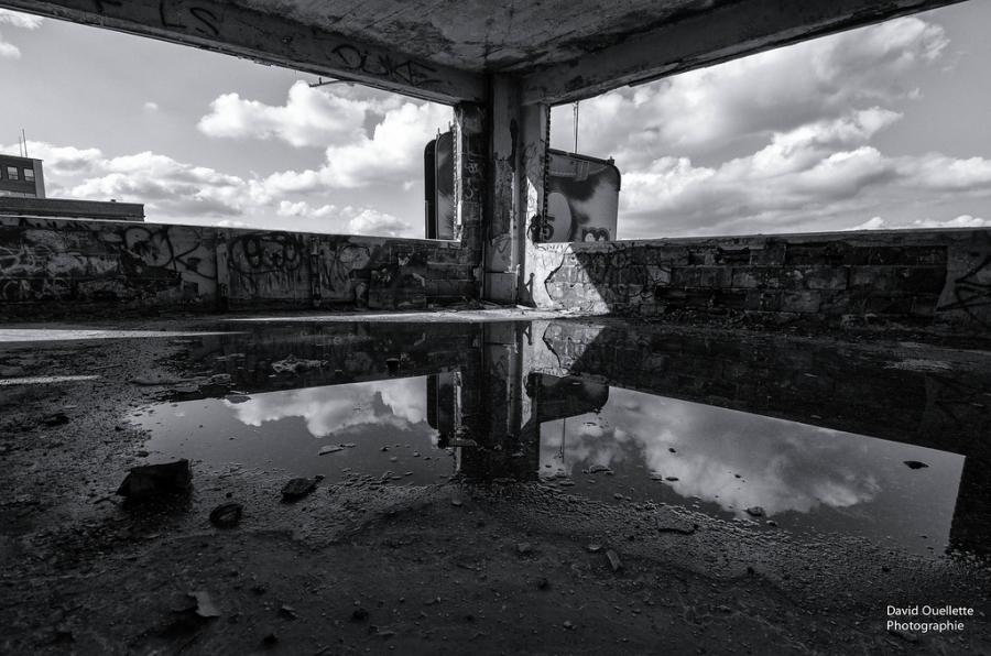 Lorsqu'on entre dans l'édifice, le premier constat est celui qu'il ne reste que peu de chose de l'édifice. En fait, mis à part le squelette, il n'y a rien, que des graffitis. Aucune division, rien que du béton, de l'eau stagnante et de la peinture qui s'écaille.