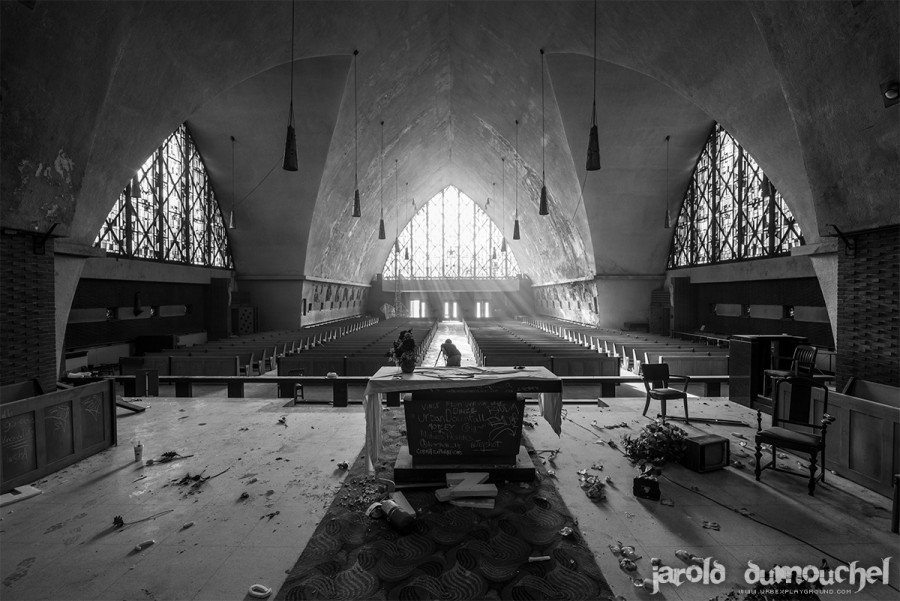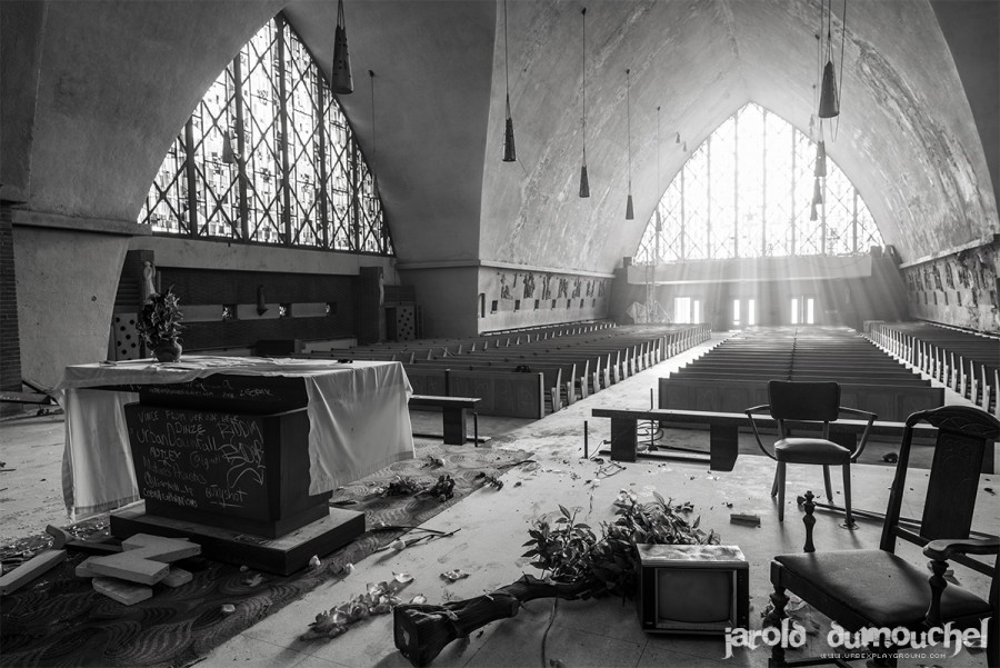 The interior of the church looks like a concreted cavern, but the square stained-glass windows in the vault above the altar offer a modern or even timeless aspect. Behind the altar, a small corridor hidden by a brick wall leads on one side to the vandalized sacristy, where the statues have their faces painted in blue and where one of them, is hanged in the closet.