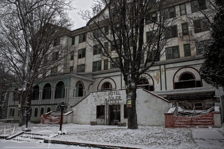 The 150-room Adler Hotel on the northern edge of the village with its Spanish style architecture was the last great hotel built prior to the great depression in Sharon Springs. The five-story hotel opened in 1927 and closed after the 2004 summer season.